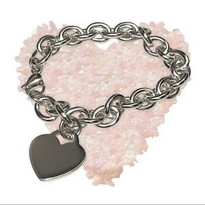 This is a gorgeous stainless steel heart tag link bracelet in 7.5 inches. Made in stainless steel, this piece is far more sturdy than those in sterling silver. This piece can be engraved for an additional fee.