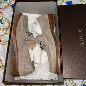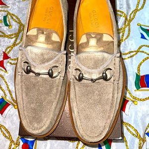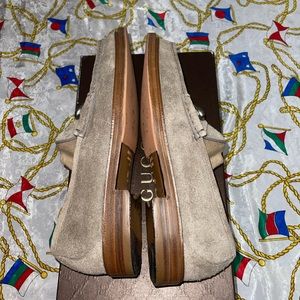 100% Authentic Suede Desert Sand Gucci Loafers, worn once! Still in pristine condition, still new basically. Comes with sole protectors installed $100 job. To protect the value of these beautiful loafers. You can tell by the soles I only wore them once.