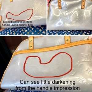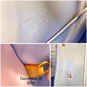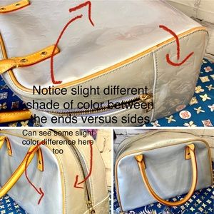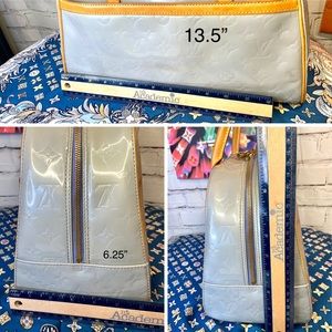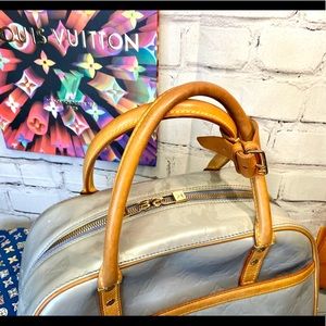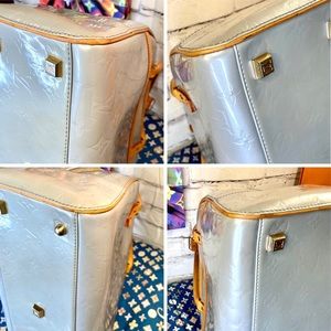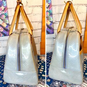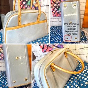 AUTHENTIC VINTAGE LV ice blue vernis bowling style handbag in very good condition!! Was well taken care of! Leather handles, piping. Trim all in good, healthy condition. Little darkening underneath handles from where hands grab it- all cleaned and conditioned. Pay extra close attention to each picture with added details about it! Zoom in too bc some of the flaws are extremely hard to notice. Overall a very nice bag! Super clean inside and out. Comes with leather handle holder that I added.