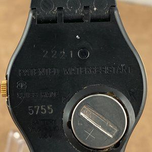 Rare Vintage Swatch Watch Moon Phase, Gold Plated Front Black Plastic Reverse , Black original 8.5 Inch Strap, Gold Markers Gold Second Hand, Black Minute and Hour Hands, Gold Sun Accents, Roman Numeral at 12 date at 6 O'clock, Crystal has minor scuffs Black Case 1 inch in diameter new 329 battery serviced Sanitized shows Moon, Sun, Stars, Celestial Moonphase Swatch Watch runs and in Good Used condition with no age cracks Swiss 1991 collectors watch