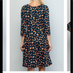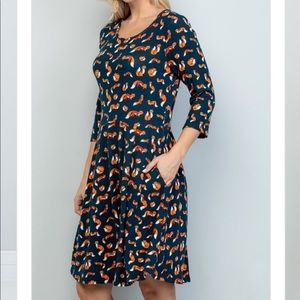 Cute fox 🦊 print dress, round neck, 3:4 sleeves, 2 pockets. Stretch knit 65% cotton & 35% polyester.