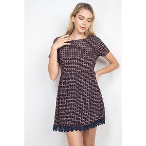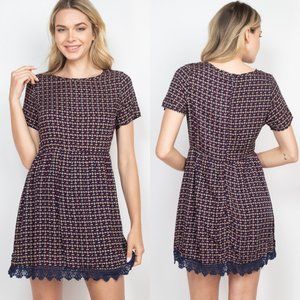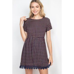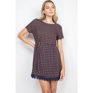 Navy taupe short sleeve round neck lace trim hem detail printed dress.
