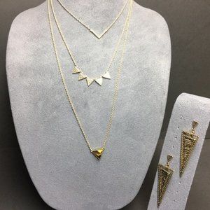 Goldtone triple necklace includes triangle with brown stone, five mini triangles with Design, V shape, matching triangle dangle earrings! I have another listing for another necklace exactly like this, no earrings. #TriangleNecklace #TriangleEarrings #GoldNecklace #GoldEarrings Lot KF50