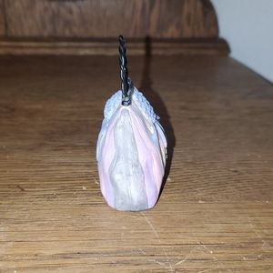 This miniature resin handbag is made of resin and is 2 1/2 inches tall by 2 3/4 inches wide.
