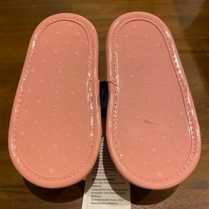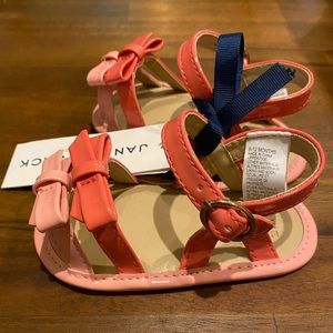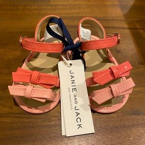 New, adorable Janie & Jack baby sandals. Two-toned pink and shiny patent material with sweet bows. Adjustable buckle with back strap to ensure they stay on baby’s feet.