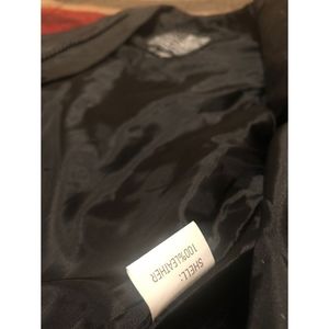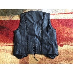 100% leather vest with snap closure, braided trim detail on the seams and lacing detail at the back. Fully lined with utility pocket on the inside. Size: S