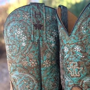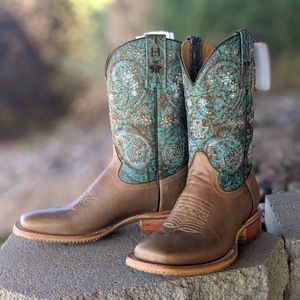 TIN HAUL ladies BAN-DAN-UH western boot is handcrafted to perfection. Handmade in Mexico of all premium leather construction. Burnished brown leather vamp/foot and Marble Aqua/turquoise Paisley or bandana print embroidered 11" leather shaft. Square toe, all leather block style roper or walking heel, cushioned insole for extra support and full leather lining. Image of carefree girl riding in obvious soles along with Tin Haul name.
