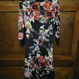 Elegant dark blue (almost black) leaf floral print dress. Only worn once, no rips, tears, or stains. Meduim sixe, b slim brand. Perfect for an evening out.