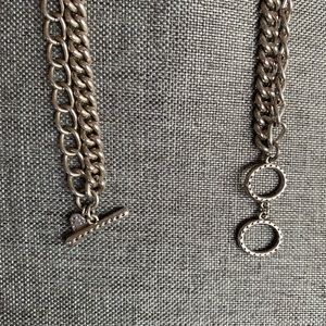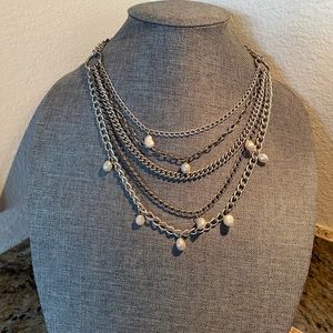 Stella & Dot Avery necklace, this is a silver multi layer chains with fresh water Pearl accents, nice toggle closure and S&D signature heart hangtag, the shortest strand lays 18” the longest about 24” long. EUC