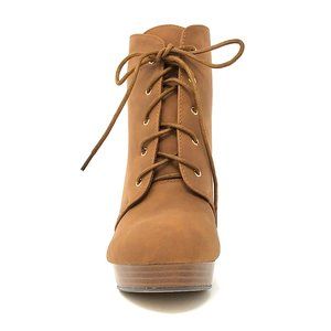 Super cute tan brown nubuck suede mid calf booties include a round toe design with wooden platform and heels. Cute cord tying laces for closure. Shoe opening hits above the ankle.
