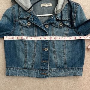 Miss Posh jean jacket, sweater type hood, size M, under arm sleeve length measures approximately 18.5”, length at front approx 16.5”. 6 button closure at front, 2 front breast pockets. Drawstring tie for hood