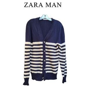 ⚪🤍⚪🤍MEN'S ZARA MAN NAVY BLUE & CREAM V-NECK LINE CARDIGAN, 100% COTTON, STRIPE DETAILS, RIBBED CUFFS, HEM ETC., SIZE XL, 29" LONG, 29" SLEEVES, 22" ARMPIT TO ARMPIT, 🤍⚪🤍⚪GREAT PRE-LOVED CONDITION, NO STAINS, SMELLS, RIPS OR TEARS ⚪🤍⚪🤍