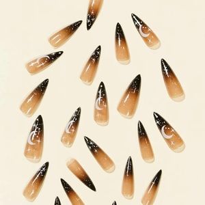 Gorgeous Halloween inspired 24 pc press on nail kit. 24 press on nails. Long stiletto shape With ombré and 🌙 and star designs. One of kind very unique. Ranging from sizes 0 to 9. Ready in minutes fashion forward manicure