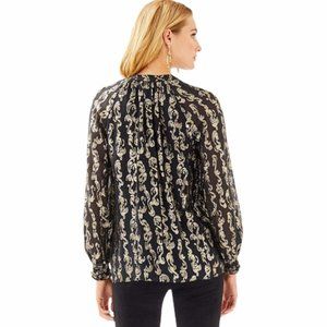 Onyx salty wave metallic clip chiffon blouse by Lilly Pulitzer. The Angelika is a festive woven top with ruffle details and blousoned sleeves. Easy fit lined top with a notch neckline and smoked cuffs.