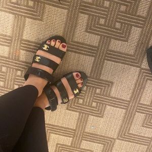 Brand new chanel black leather flat Sandals! Gold CC and Velcro strap. Never worn.