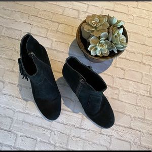 Soft suede swishes and dances along the side of the Niurka retro inspired bootie. M=Medium width. Round toe. Suede construction. Side fringe detail.