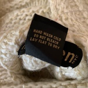 Beautiful creamy ivory sweater that is NWT, no flaws. Ivory with a little golden thread woven into the knit. Pullover style with front patch pockets. Turtle/cowl type neck. Has armholes.