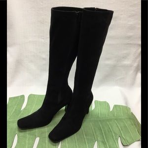 I Ship Fast. You will love these Sleek Black Suede Boots by Delicious. All Man made Materials. Size 8-1/2”M. Heel Height is 3-1/2”. Boot Height 18-1/2”. 13 inches around the Top. Hardly Worn. Very Good Condition.