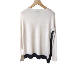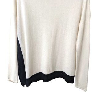 Cream coloured asymmetrical sweater with black trim by Alice + Olivia. Made from a soft and lightweight wool blend yarn.