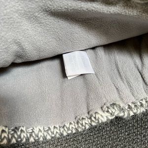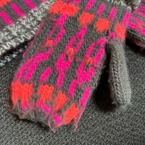 Acrylic knit. The scarf has fleece lining. Some fuzzies on the mittens but no holes. Worn for one season at approx 8-10 size.