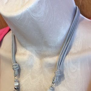 Four light gray leather-like straps connected with two silver emblems embellished with a large marble piece, shiny beads and strings, plus dangling silver accents.