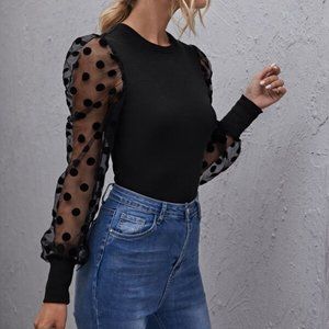 Black sheer long sleeve polka dot blouse fitted