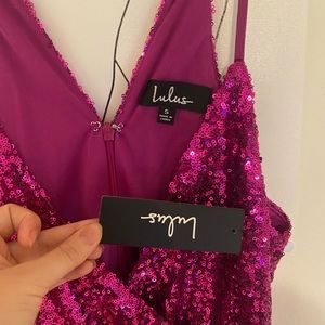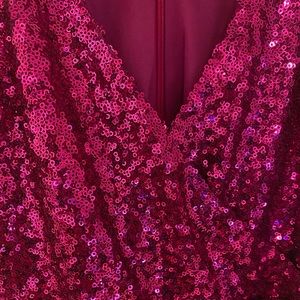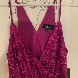 Lulus Hilaria Fuchsia Sequin Bodycon Mini Dress! Dazzling sequins, over a stretch knit lining, fall from slender straps, into a surplice neckline and darted, sleeveless bodice. Fitted waist and bodycon mini skirt with a faux wrap envelope hem complete this flirty look. Back keyhole with top button and hidden zipper/clasp.