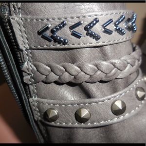 Zippers on insides of each boot for easy on and off fit. Beautiful accents of 3 straps - one beaded, one braided and one with studs. Spat covers. Leather-like man made materials. Heels are 1”. Boots are 5.5 inches tall at highest point. Very good used condition. Smoke free home.