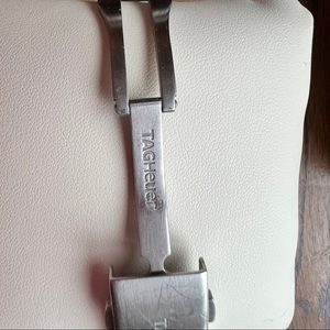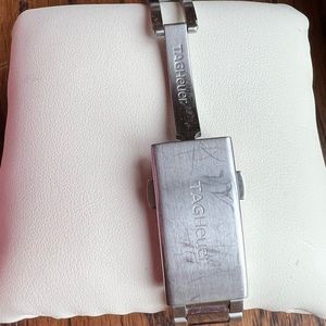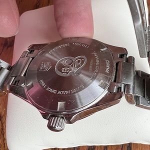 Mother of Pearl dial enhanced by luminous silver-tone hands. Silver-tone stainless steel case with a silver-tone stainless steel band. Quartz movement. 300 meters / 1000 feet water resistance. Uni-directional Rotating bezel. Scratch Resistant Sapphire crystal. Screw In caseback. Deployment clasp. Screw Down crown. Case size 32 mm x 9.5 mm. Band 22 mm x 8 inches long. Tag Heuer WAY1314.BA0915 Aquaracer Watch.