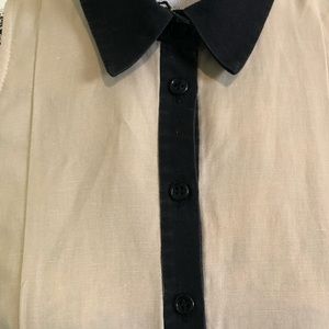 Caramel Beige/Coffee/Black Trim Linen-Blend Sleeveless Pleated Fit&Flare Swing Top. Not lined. Classic collar. Button-down. Pleated design for a full swing style top. Gently worn but excellent condition. Keep casual with jeans and flats, or dress up with pants and strappy sandals. Lovely wardrobe item!