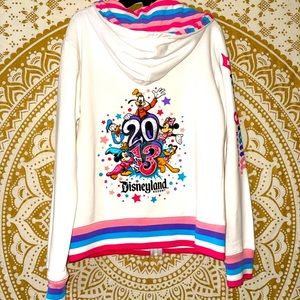 DISNEYLAND PARKS “2013” ZIP-UP WHITE JACKET WITH CHARACTERS, POCKETS & HOOD. HAS WORKING ZIPPER.
