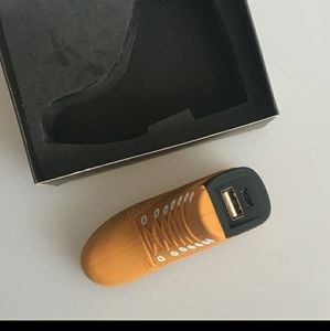 Tiny timberland boot in shoe box with USB powerbank. Super cute, would be great to take hiking or fishing to make sure you don't run out of battery in your devices. Charging input is micro USB, you can charge any device from the boot using its regular power cable.