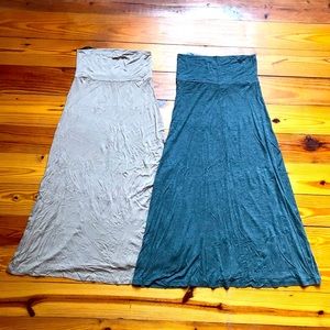 Two maxi skirts! Neutral colors. Heather Grey and Beige/Taupe. Waist: 13-14”, Length: 37-38”. Boho.