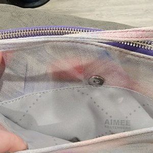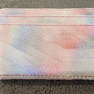 NWOT, suede rainbow brushed print with iridescent shimmer crossbody purse. Silver accents with 1 snap outter pocket. Inside is grey with 1 inner zipper pocket and 2 small open pockets. Comes with duster bag and matching shimmer card wallet. Comes from animal friendly home.