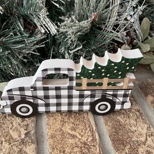 Fabulous Rustic Black & White Buffalo Check Plaid Wood Farmhouse Pickup Vintage Truck hauling a tree! Perfect accent for your farmhouse Country Christmas decor! Fantastic accent for your tabletop display book shelf or fireplace mantel! Add to a tiered tray for a unique centerpiece! Pairs well with modern Farmhouse Cottage French Country Boho or shabby chic decor styles!