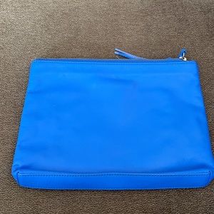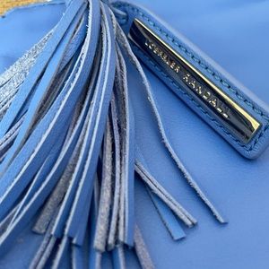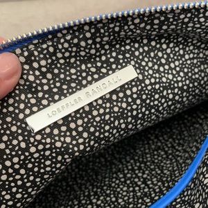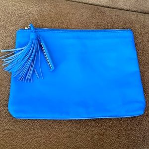 Gorgeous color! Beautiful bright blue leather bag by Loeffler Randall, smooth and soft, slim minimalist lines, great as a clutch or to toss into a larger bag, Lining has a dotted print that reminds me of stingray, single sidewall pocket, zipper top closure with cute leather fringe tassel. In excellent condition, looks like new. Overall size approx 11 x 8 inches. Will ship in a dustbag (not the original brand)