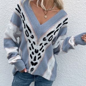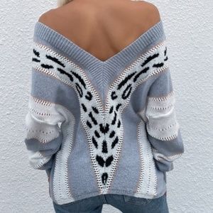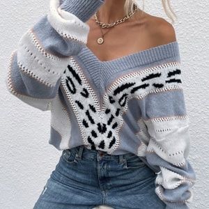 Blue White Leopard Print Off Shoulder Oversized Light Sweater
