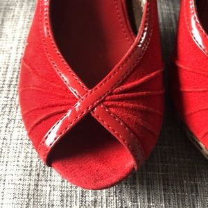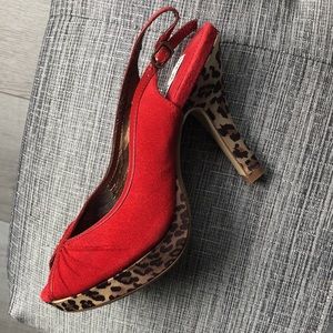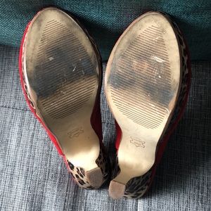 Open toe Leopard print heel & platform are sure to draw attention! Red patent leather piping. Padded insoles. Ankle strap closure. 4.5 inch heel, 1 inch front platform.