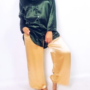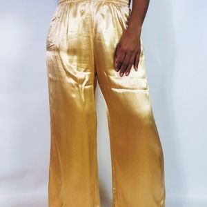 Gold satin wide leg satin pajama pants with elastic waist and side pockets.
