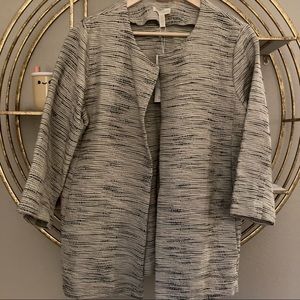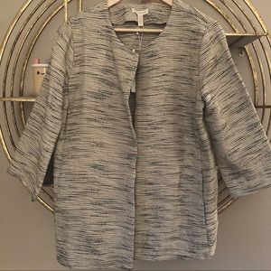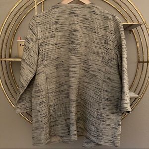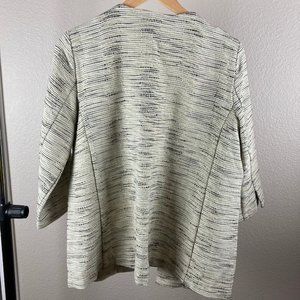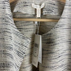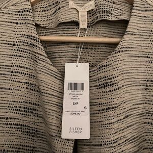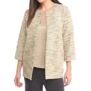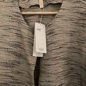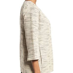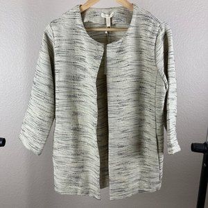 Beautiful Eileen Fisher open front jacket in the natural color. Cream colored base with black woven throughout. Round neckline. Oversized fit, has pockets. New with tags!