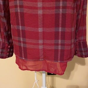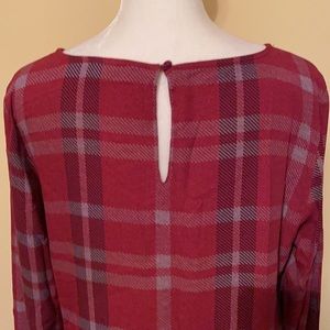 Ladies small The Limited blouse, dark red plaid design with light grey and black, two lightweight 100% polyester layers, small button at the top of the peep hole at the top on the back