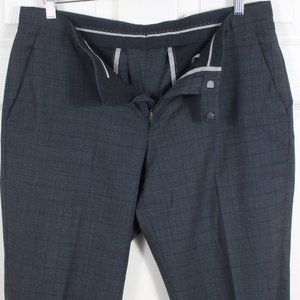 Notch-Lapel modern silhouette 98% Wool Gray Check BOSS Hugo Boss Suit. Single-Breasted 2-button, double-vented, flap front pockets. Flat-front uncuffed pants. The James4/Sharp6 fit.