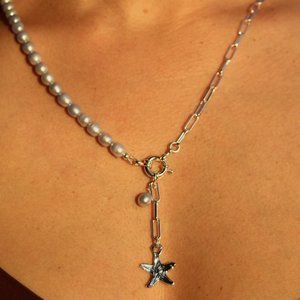 Made with fresh water pearls and chain. Accentuated with a star fish pendant and a pearl. Chain is a non-tarnish and lead free.