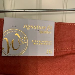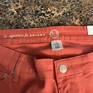NWT Dress Barn jeans Size 16 in dark clay/orange color called Sedona Skies. Fabric, care and size information in pictures