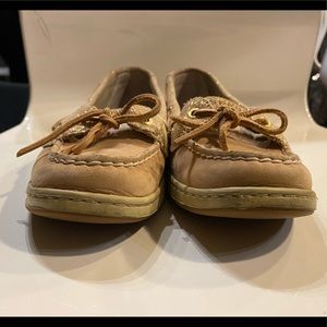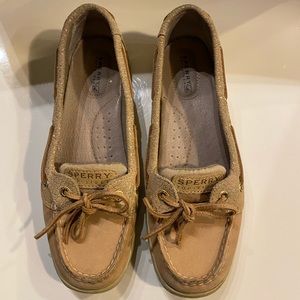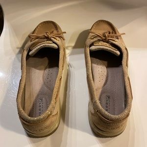 These are tan Sperry Top-Sider shoes with gold detailing. Light signs of wear as pictured but generally good condition. High quality, well made shoes.