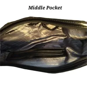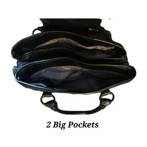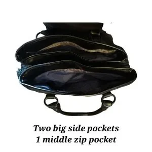 This medium sized purse has 3 Pockets. 2 big Pockets and 1 small in the middle that zips closed with a tassel Zipper.