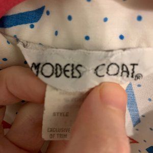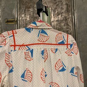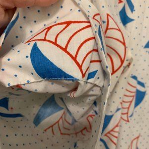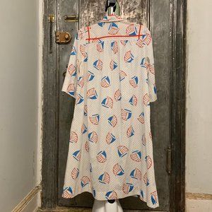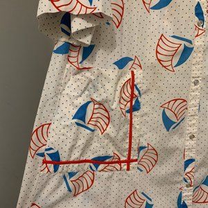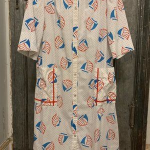 Adorable kitsch vintage house coat short sleeve midi length dress from the 70s or 80s most likely 80s. Made in USA by the brand Model Coat. White with red and blue sailboat polka dot pattern in that mod patriotic red white and blue style of the 70s and continued into the 80s. With red trim design on front and back shoulders and on the two front pockets. Full snap down of silver snaps that look like buttons. Summer spring light weight dress or housedress that snaps down. Short puff sleeves. Loose comfortable fit that has a straight full silhouette. Casual go to comfortable house dress, nightgown beach cover up. I can't read fabric contents but feels like a cotton or cotton polyester blend with no stretch. Hand sewn sleeve and bottom.