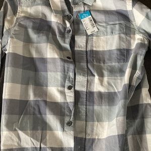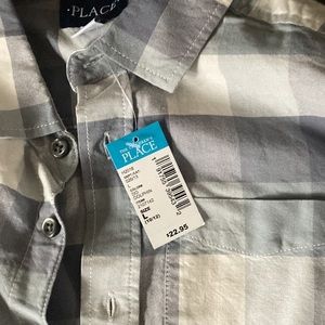 New with tags boys size 10 grey buffalo plaid button down shirt. Not flannel but heavy enough or light enough for most seasons!!