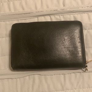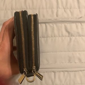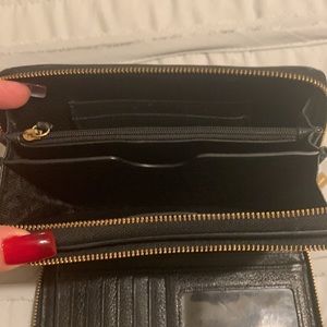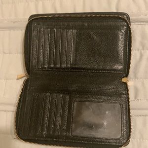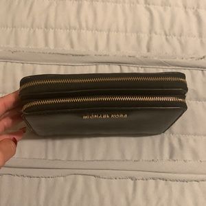 Black Mk Wallet with a lot of spaces to keep money cards etc has gold zipper free of smoke has a little detail on the corner gently worn