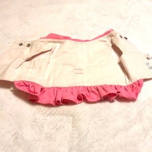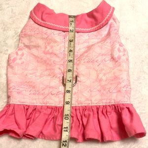 This is a custom made by Patricia Kinder toy dog clothes. It is pink cotton that is lined with adjustable straps and strong snaps. The straps have elastic on one side to give comfort when moving around. If the dog gains more weight it gives at least another